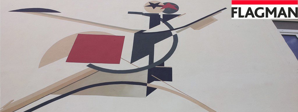 | Группа молодых художников при поддержке компании MAV воссоздала на стене здания «Арт-пространства на Толстого, 7» в Витебске фигурин — сценографический эскиз — Эль Лисицкого «Новый». Так городу вернули имя известного художника. |